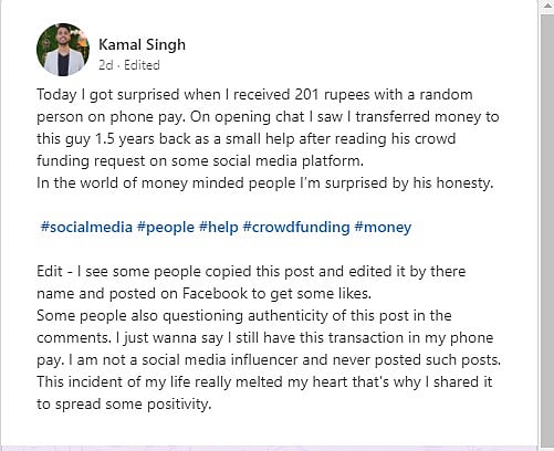 கமல் சிங் என்பவர் பொறியாளராகப் பணியாற்றி வருகிறார். அவருடைய வங்கி கணக்குக்கு முகம் தெரியாத நபரிடமிருந்து ரூ.201 போன்பே மூலம் வந்திருப்பதாக ஒரு மெசேஜ் வந்திருக்கிறது.அவர் தற்செயலாக யாரிடமிருந்து பணம் வந்திருக்கிறது என்பதை தெரிந்து கொள்ள தன்னுடைய போன்பே-வை பார்த்திருக்கிறார். அப்போது ஒரு நபர் ஒன்றரை ஆண்டுகளுக்கு முன்பு தன்னுடைய தாயின் சிகிச்சைக்காக சமூக வலைதளங்களின் மூலம் நிதி திரட்டியிருக்கிறார்.