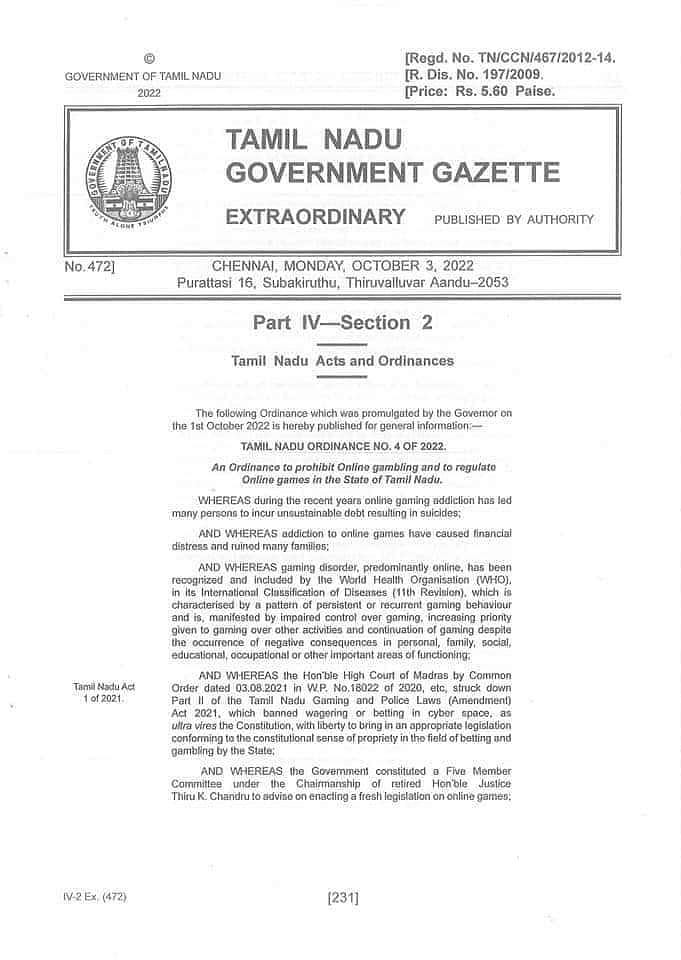 அரசிதழில், ``ஆன்லைன் சூதாட்ட தடைச் சட்டம் இயற்றப்பட்ட பின்னர் தமிழ்நாட்டில் எந்த நபரும் ஆன்லைன் சூதாட்டத்தில் ஈடுபடமுடியாதவாறு தடை விதிக்கப்பட்டுள்ளது. ஆன்லைன் சூதாட்டம் தொடர்பான விளம்பரங்களுக்குத் தடை. எந்த ஊடகங்களிலும், செயலிகளிலும், நேரடியாகவோ, மறைமுகமாகவோ ஆன்லைன் சூதாட்டம் தொடர்பான விளம்பரங்களுக்குத் தடை விதிக்கப்படுகிறது. ஆன்லைன் சூதாட்ட நிறுவனங்களுக்கு வங்கி பணப்பரிமாற்றம் செய்ய வங்கிகள் ஒத்துழைக்கத் தடை. சூதாட்டம் அல்லாத இதர ஆன்லைன் விளையாட்டுகளுக்கு ஒழுங்குமுறை ஆணையம் அமைக்க முடிவு. ஆணையத்தின் உறுப்பினர்களாக ஐ.டி வல்லுநர், உளவியல் நிபுணர், ஆன்லைன் விளையாட்டு வல்லுநர் ஆகியோர் இடம் பெறுவார்கள். இந்த ஆணையம், ஆன்லைன் விளையாட்டுகளுக்கு அனுமதி வழங்குவது, கண்காணிப்பது, தரவுகளைச் சேகரிப்பது, குறைகளுக்குத் தீர்வு காண்பது, விதிமுறைகளை மீறினால் நடவடிக்கை எடுக்கப் பரிந்துரை செய்வது போன்ற பணிகளை மேற்கொள்ளும்.