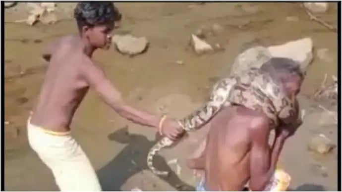 #Watch: झारखंड के गढ़वा में अजगर को गले में माला की तरह लटकाने की कोशिश एक शख्स को भारी पड़ गई। अजगर ने शख्स की गर्दन को बुरी तरह जकड़ लिया।#Jharkhand #Python #Viralvideo pic.twitter.com/5qdtFpJZnY