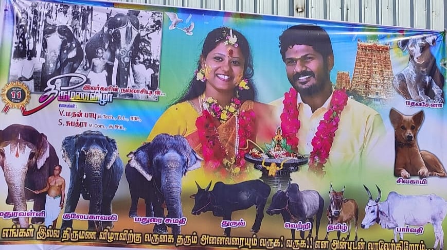 இந்த நிலையில்தான் மதுரை ஒத்தக்கடை பகுதியில் திருமண மண்டப வாசலில் வைக்கப்பட்டிருந்த ஒரு வாழ்த்து பிளக்ஸ் திரும்பி பார்க்க வைத்தது. இராம நாராயணன் பட போஸ்டர்போல் யானை, காளை, நாய் படங்களை இடம்பெறச்செய்து அவைகள் மணமக்களை ஆசிர்வதித்து மக்களை வரவேற்பதுபோல் சித்தரிக்கப்பட்டிருந்தது.