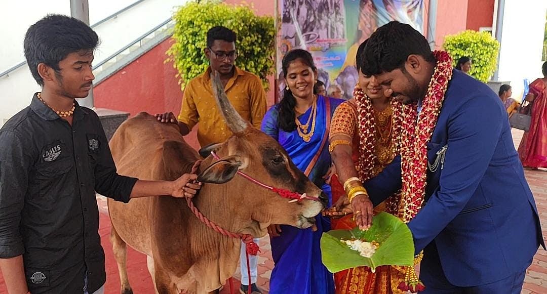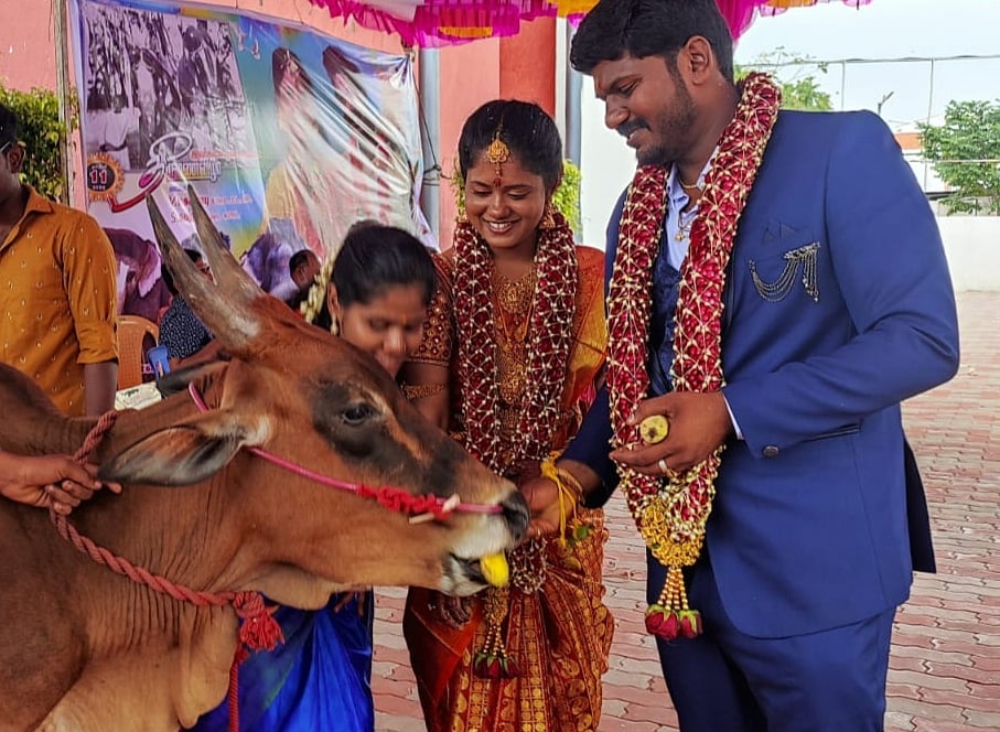 அது மட்டுமின்றி, திருமண விருந்தின்போது உறவினர்களை கவனித்ததுபோல், தான் வளர்த்து வரும் தமிழ் என்ற ஜல்லிகட்டு காளையை மண்டபத்துக்கு அழைத்து வந்து அதற்கு மணமகளுடன் சேர்ந்து விருந்து உபசரித்தார்.