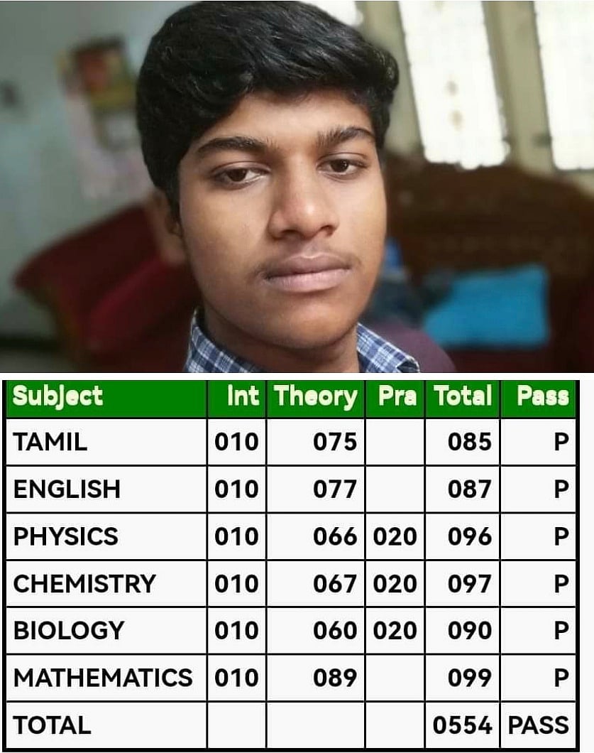 இன்னைக்கு என் பையன் கவர்ன்மென்ட் ஸ்கூலுக்கும், அரசுப் பள்ளி ஆசிரியையான அம்மாவுக்கும் பெருமை சேர்த்திட்டாரு. ரொம்ப சந்தோஷமா இருக்கு. அவருக்கு எம்.பி.பி.எஸ் படிக்க விருப்பம். நிச்சயம் அதுலயும் சாதிப்பாருங்கிற நம்பிக்கை வந்திருச்சு" என்கிறார் நெகிழ்ச்சியாக.