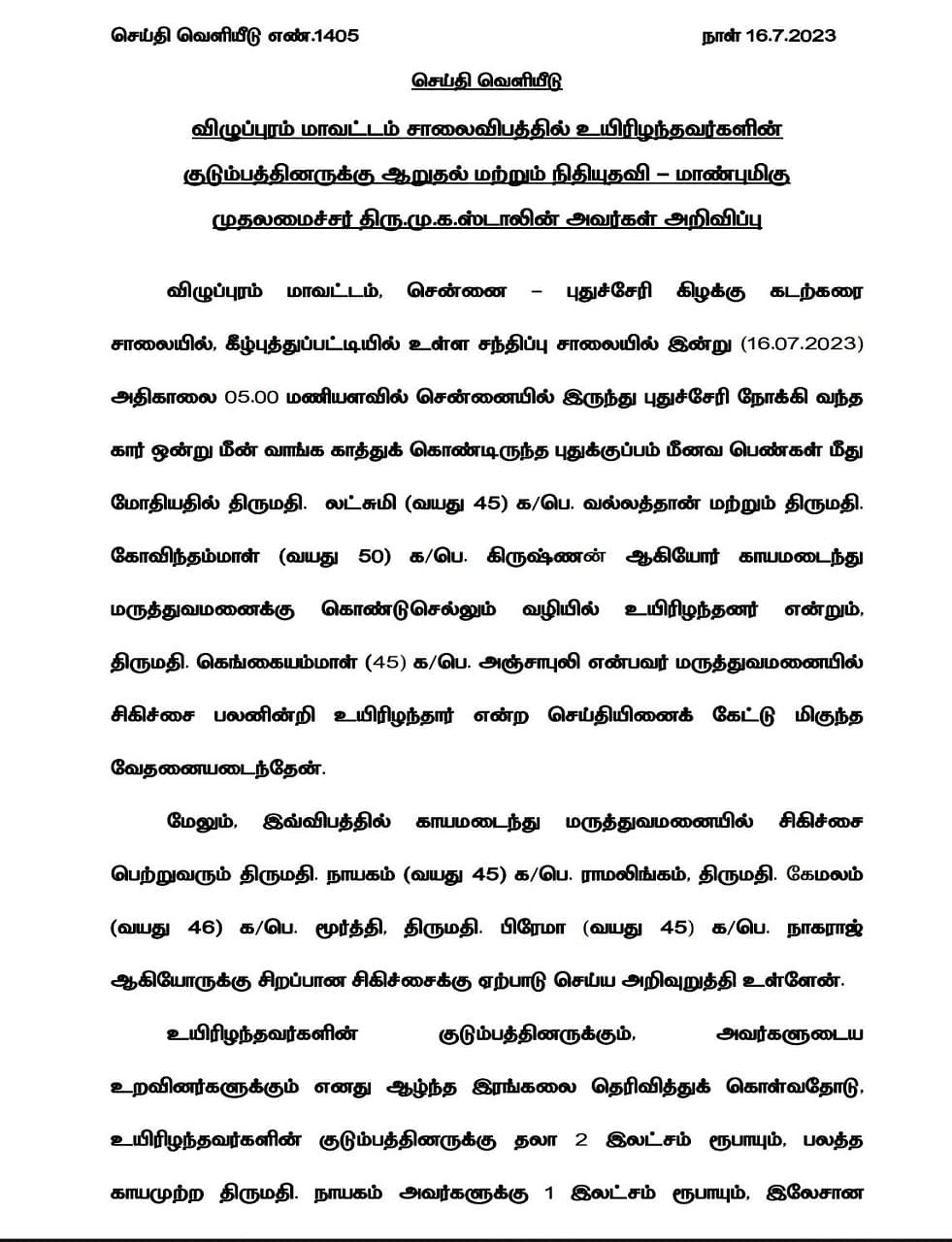 மேலும், நாயகம், கோமலம், பிரேமா என்ற மூன்று பெண்களும் மருத்துவமனைகளுக்கு கொண்டு செல்லப்பட்டு சிகிச்சைக்காக அனுமதிக்கப்பட்டனர். இந்த நிலையில், இந்த விபத்தில் உயிரிழந்தவர்களுக்கு இரங்கலை தெரிவித்துள்ள தமிழக முதலமைச்சர் ஸ்டாலின்... உயிரிழந்தவர்களின் குடும்பத்திற்கு தலா 2 லட்சமும், பலத்த காயமடைந்த நாயகம் என்ற பெண்ணிற்கு ஒரு லட்சமும், லேசான காயமடைந்து சிகிச்சையிலுள்ள மற்ற இருவருக்கு தலா 50 ஆயிரம் ரூபாயும் முதலமைச்சரின் பொது நிவாரண நிதியிலிருந்து வழங்கிட உத்தரவிட்டிருந்தார்.