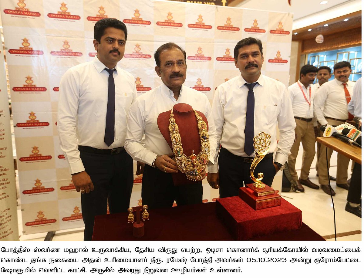 தமிழ்நாட்டின் தலைசிறந்த தங்க நகை பிராண்டான போத்தீஸ் ஸ்வர்ண மஹால் அதன் புதுமையான மற்றும் தனித்துவமான கலைநயப் படைப்பிற்காக, "பிரைடல் கோல்டு ஜுவல்லரி ஆஃப் தி இயர் 2023" விருதை இரண்டாவது வெற்றியாளராகப் பெற்று சாதனை படைத்துள்ளது.