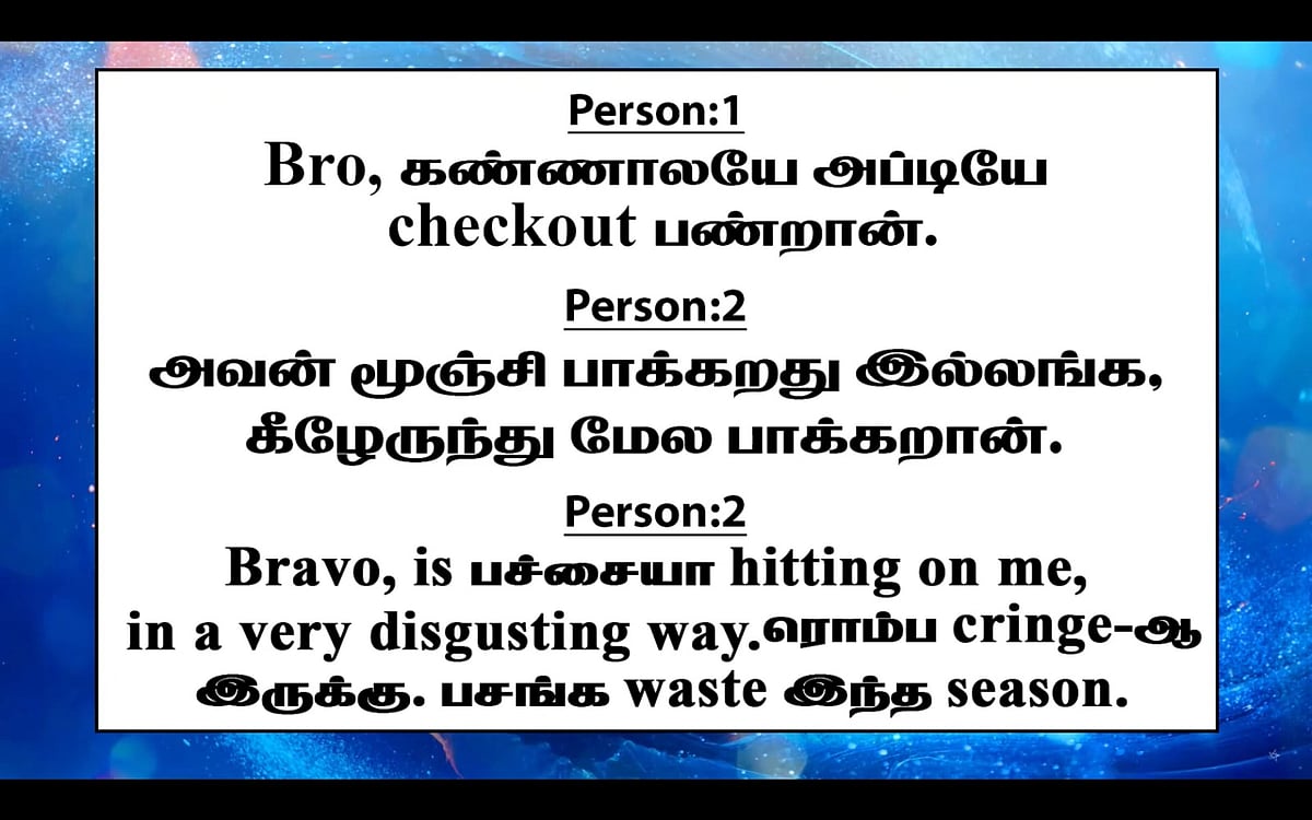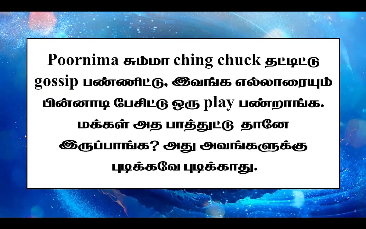 பிக் பாஸ் போட்டியாளர்கள்தினேஷ் குறித்து ஜோவிகா சொன்ன கமென்ட்வினுஷா குறித்து நிக்சன் சொன்ன கமென்ட்பிராவோ குறித்து மாயாவும் ஐஷூவும் பேசிய கமென்ட்ஜோவிகா குறித்து அர்ச்சனா சொன்ன கமென்ட்இது மாயா குரூபிற்கு அர்ச்சனா சொன்ன ஸ்டேட்மென்ட்.பூர்ணிமா குறித்து விஷ்ணு சொன்ன ஸ்டேட்மென்ட்கூல் சுரேஷ் குறித்து விசித்ரா சொன்ன கமென்ட்இது மாயா சொன்ன ஸ்டேட்மென்ட்பிக் பாஸ் போட்டியாளர்கள்